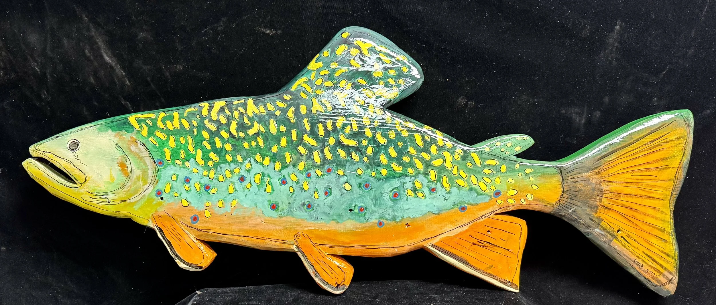 Brook Trout 11-12-25, 45x18 inches, southern yellow pine gesso, acrylic, ink and polyurethane. 500.00. (pine is from a 100 year old building in Petersburg Va.)