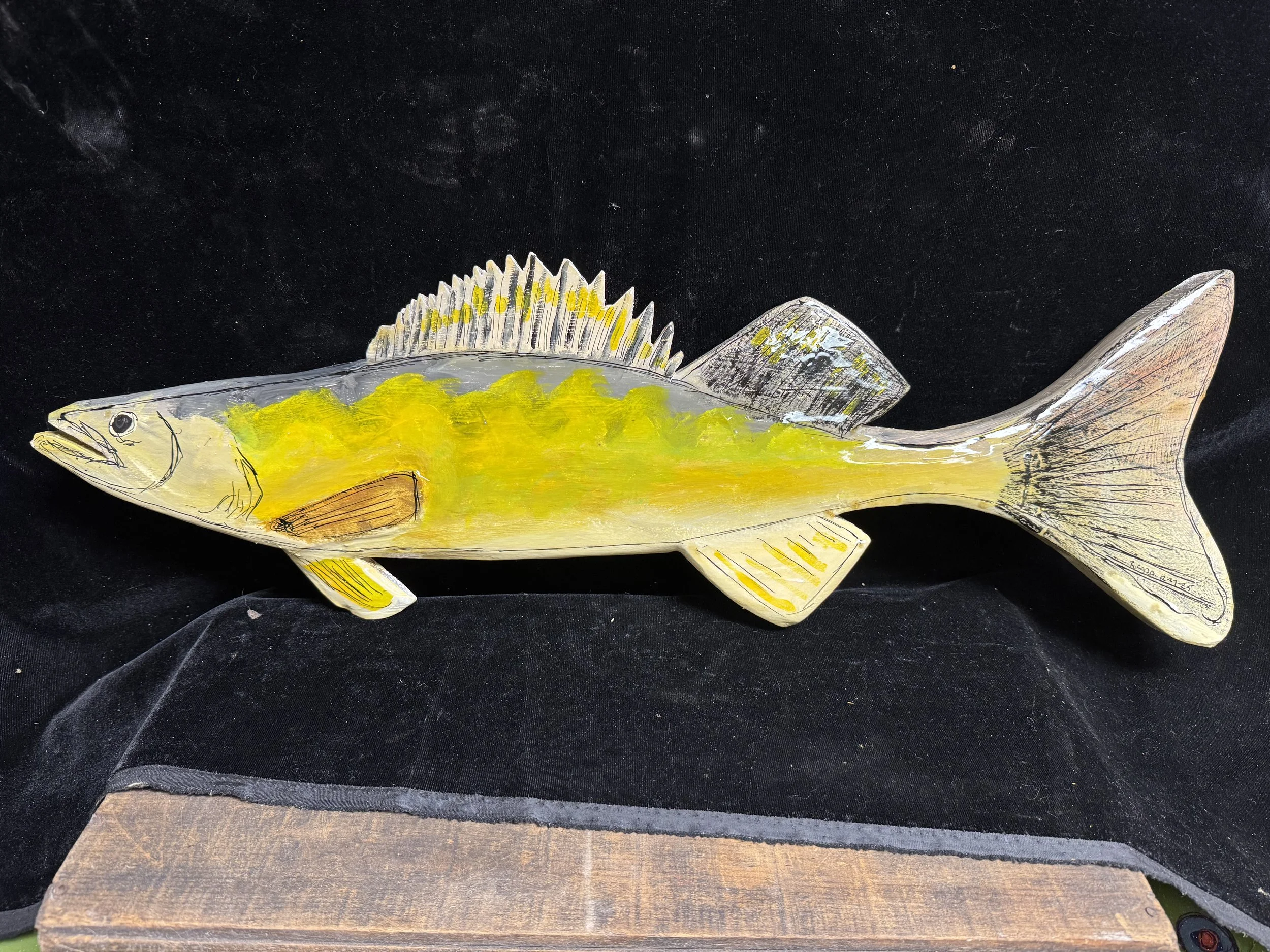 Walleye, 12-27-25, 32x8 inches, pine with gesso, acrylic, ink and polyurethane 175.00